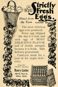 This is an original 1903 black and white print ad for Fresh Eggs from Henry Cutler located in Ionia, Michigan.
