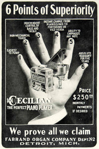 This is an original 1903 black and white print ad for the Cecilian piano player that was made and sold by the Farrand Organ Company of Detroit, Michigan (MI) during the Edwardian era.