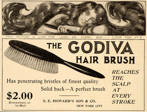 This is an original 1903 black and white print ad for the Godiva Hair Brush by S. E. Howard's Son and Company located in New York City, New York.