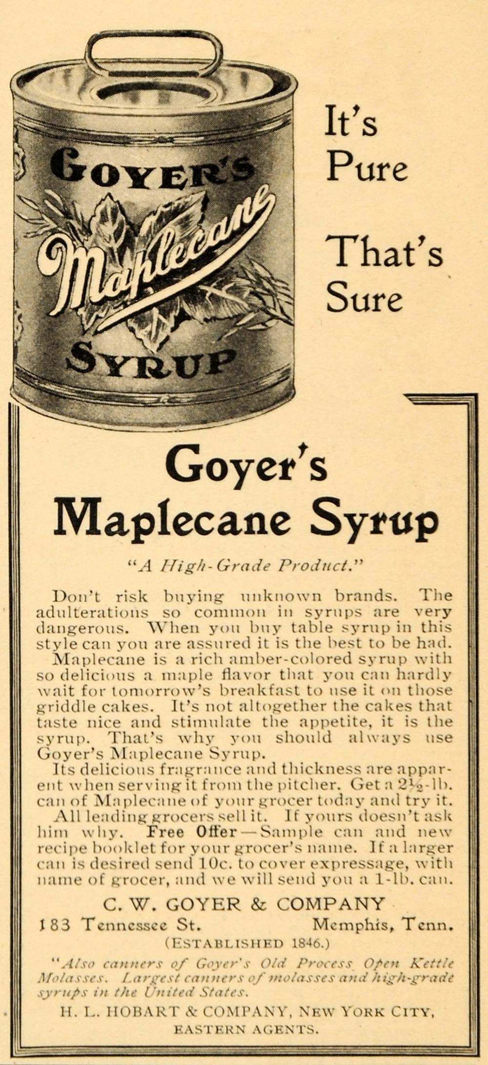 This is an original 1903 black and white print ad for Goyer's Maplecane Syrup by C. W. Goyer and Company located at 183 Tennessee Street, Memphis, Tennessee and by H. L. Hobart and Company located in New York City, New York.