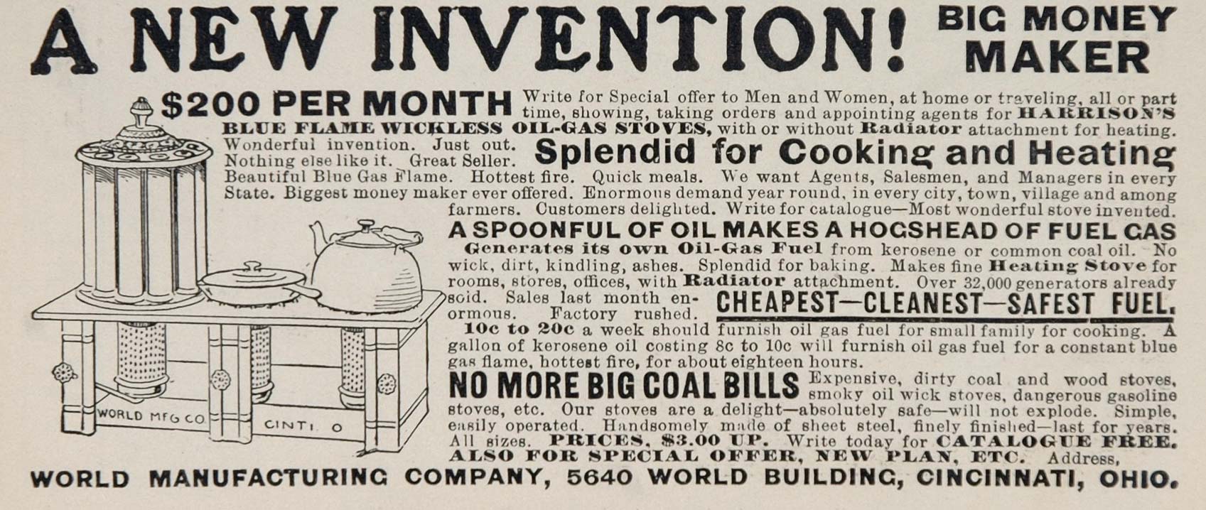 This is an original 1903 black and white print ad for the Harrison Blue Flame Wickless Oil Gas Stove from the World Manufacturing Company, 5640 World Building, Cincinnati, Ohio.