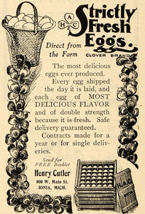 This is a small original 1903 black and white print ad promoting fresh eggs from Henry Cutler located at 800 W. Main Street, Ionia, Michigan.
