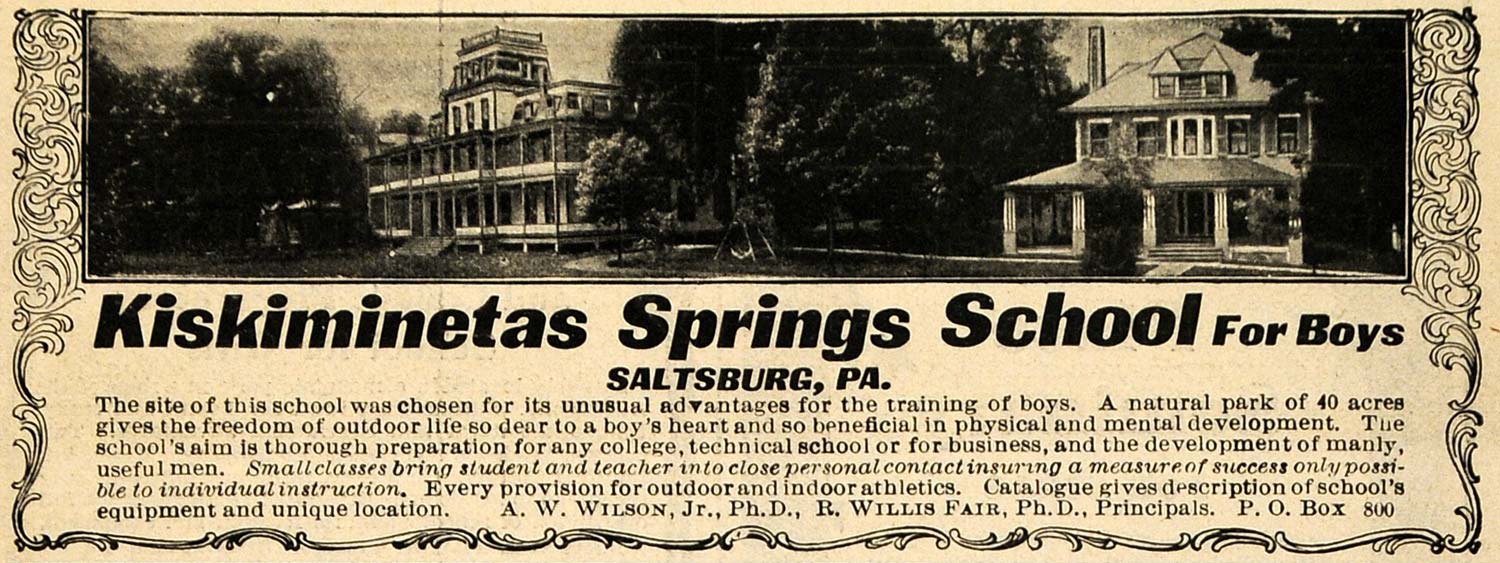This is an original 1903 black and white print ad for Kiskiminetas Spring School for Boys ran by A. W. Wilson Jr. and R. Willis Fair located in Saltsburg, Pennsylvania.