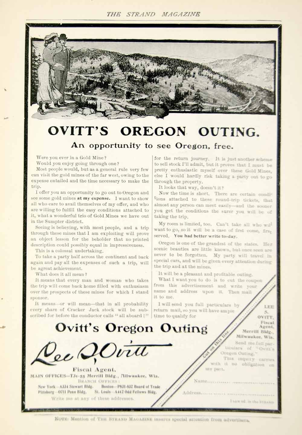 This is an original 1903 black and white print ad for an opportunity to see Oregon gold mines for investment possibilities with Lee S. Ovitt, Fiscal Agent, Milwaukee, WI for Ovitt's Oregon Outing.