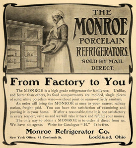 This is an original 1903 black and white print ad for Monroe porcelain refrigerators by the Monroe Refrigerator Company of Lockland, Ohio. The New York office is located at 42 Cortlandt Street, New York City.
