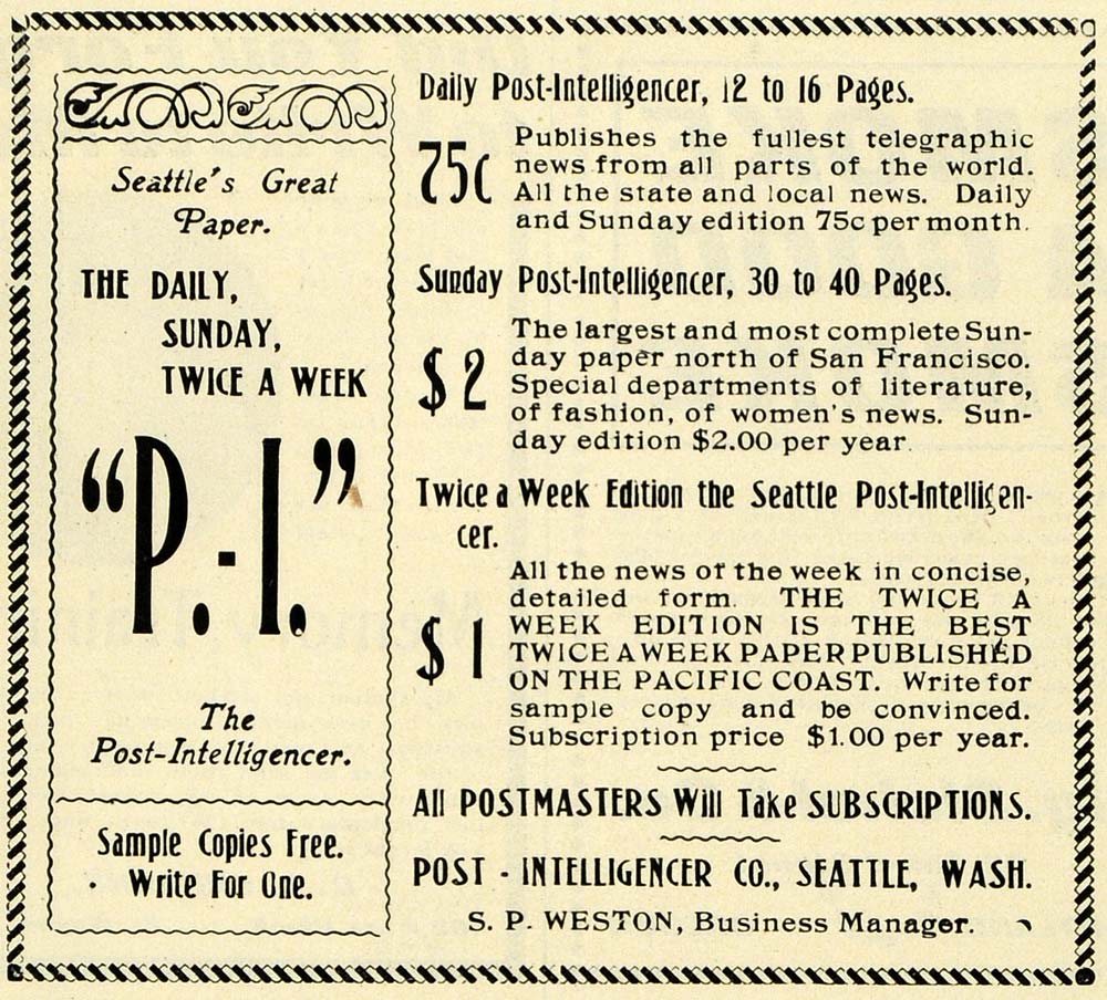 This is an original 1903 black and white print ad for The Post-Intelligencer Company of Seattle, Washington. The business manager for the company was S. P. Weston.