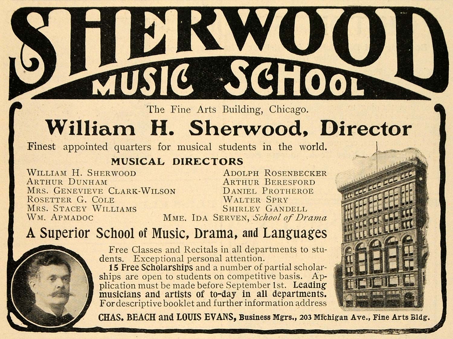 This is an original 1903 black and white print ad for the Sherwood Music School directed by William H. Sherwood and located in Chicago. This ad lists a few of the musical directors and this includes Arthur Dunham, Genevieve Clark-Wilson, Rosetter G. Cole, Adoplh Rosenbecker, Daniel Protheroe, and Walter Spry.