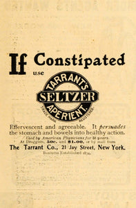This is an original 1903 black and white print ad for Tarrant Seltzer Aperient to facilitates digestion and alleviates constipation from Tarrant Company located at 21 Jay Street, New York.