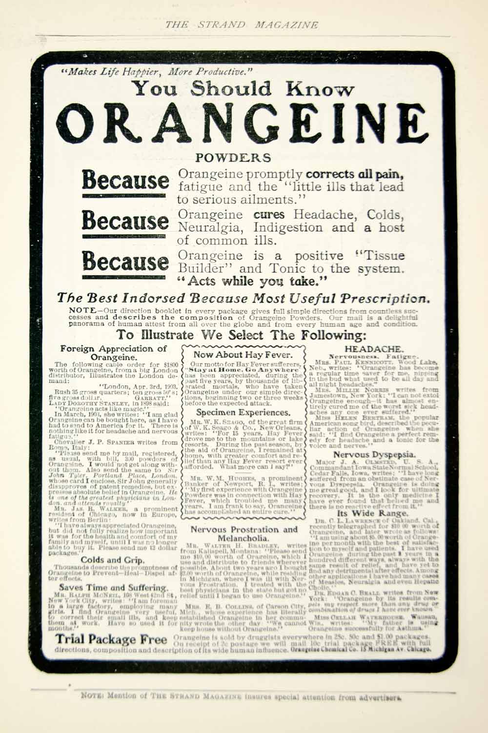 This is an original 1903 black and white print ad for Orangeine Powders --a cure for many ailments (with testimonials).