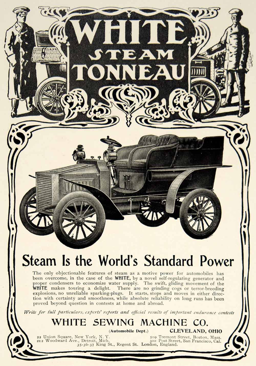 This is an original 1903 black and white print ad for the White steam tonneau automobile that was made and sold by the White Sewing Machine Company of Cleveland, Ohio (OH) during the Edwardian era.