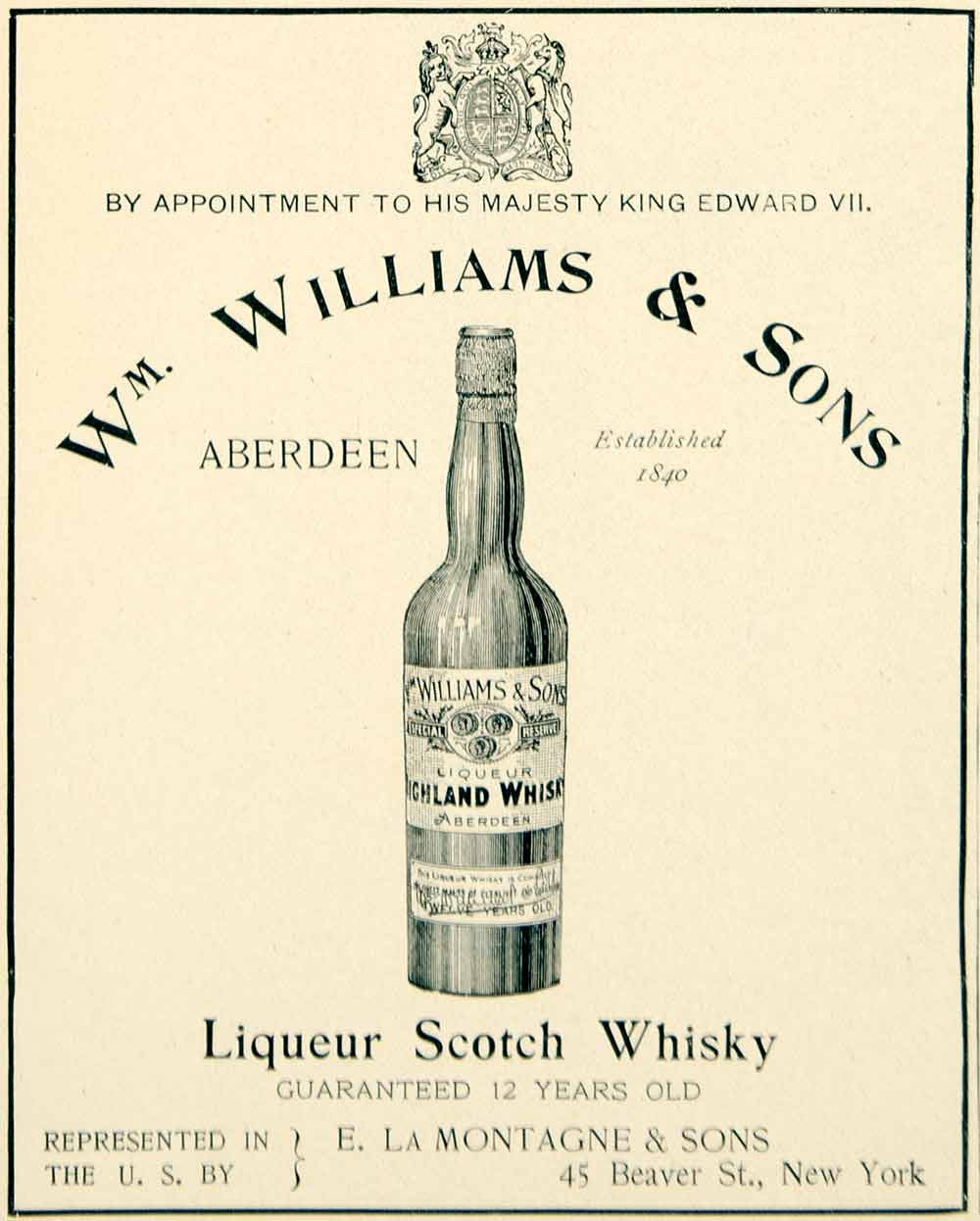This is an original 1903 duotone print ad for William Williams & Sons scotch whisky that was sold by E. La Montagne & Sons of 45 Beaver Street, New York, NY.