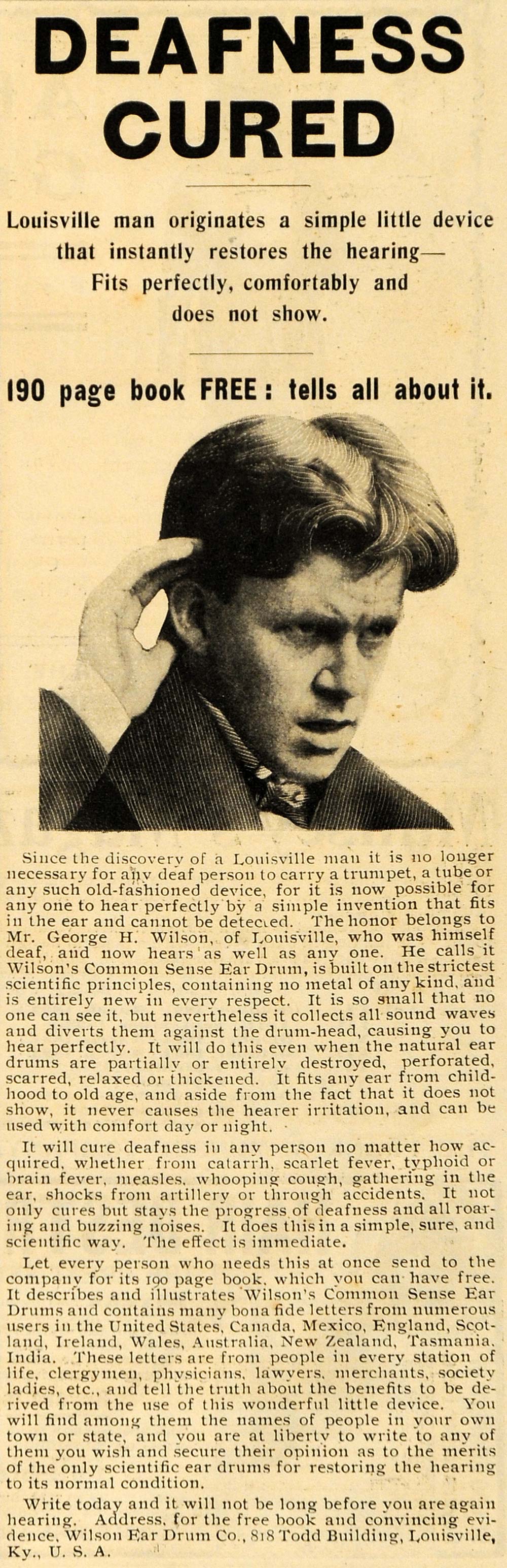 This is an original 1903 black and white print ad for the Wilson Ear Drum Company located at 818 Todd Building, Louisville, Kentucky.