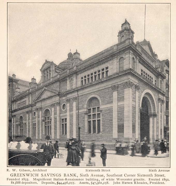 This is an original 1903 halftone print of the Greenwich Savings Bank on Sixth Avenue at 16th Street in New York City. Please note that there is printing on the reverse.