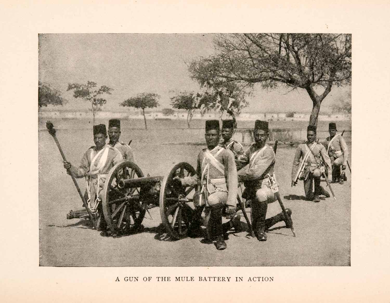 This is an original 1903 black and white halftone print of the Mule Battery preparing for battle with their cannon.