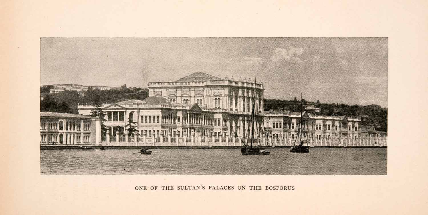This is an original 1903 black and white halftone print of the Sultan's Palace on the Bosphorus or also known as the Istanbul Strait.