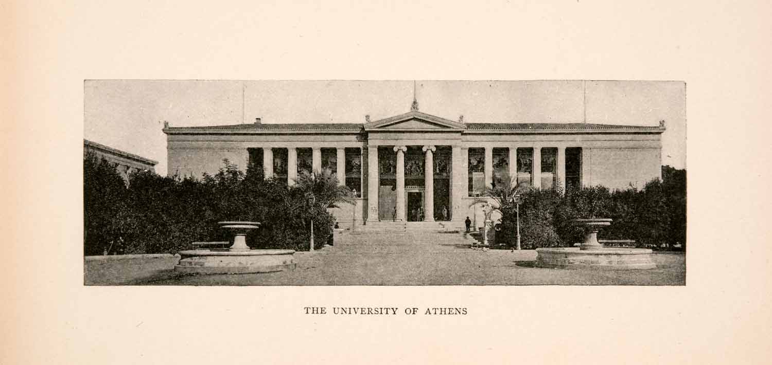 This is an original 1903 black and white halftone print of the University of Athens in Greece.