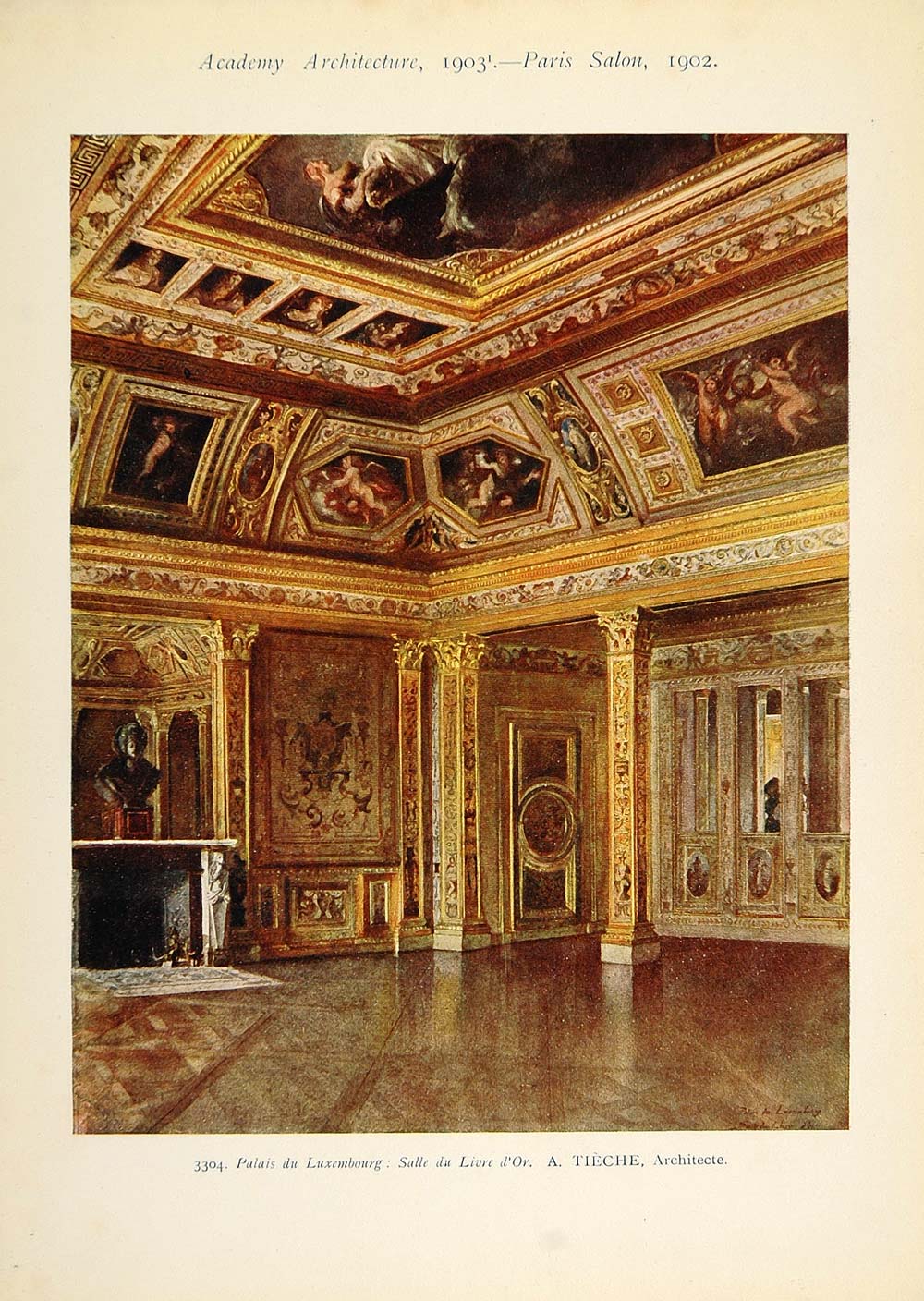 This is an original 1903 color print of a painting by A. Tieche of the Salle du Livre d'Or in the Luxembourg Palace in Paris, France.