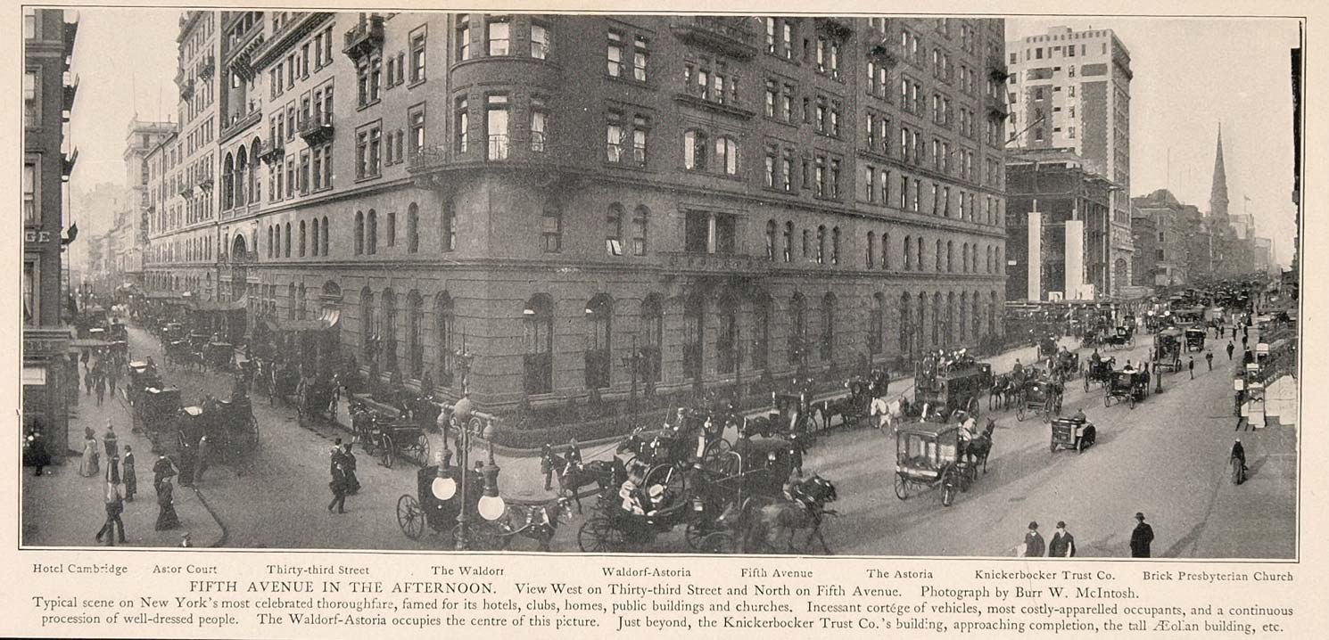 This is an original 1903 halftone print of Fifth Avenue and 33rd Street on a typical 1903 afternoon in New York City. Visible structures are the Hotel Cambridge, Astor Court, the Waldorf-Astoria, the Astoria, Knickerbocker Trust Co. and Brick Presbyterian Church. Please note that there is printing on the reverse.