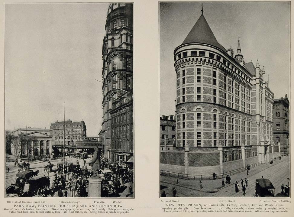 This is an original 1903 halftone print with two views of New York City: Park Row, Printing House Square and Tryon Row on the left and the New City Prison on the site of the Tombs, on the right. Please note that there is printing on the reverse.