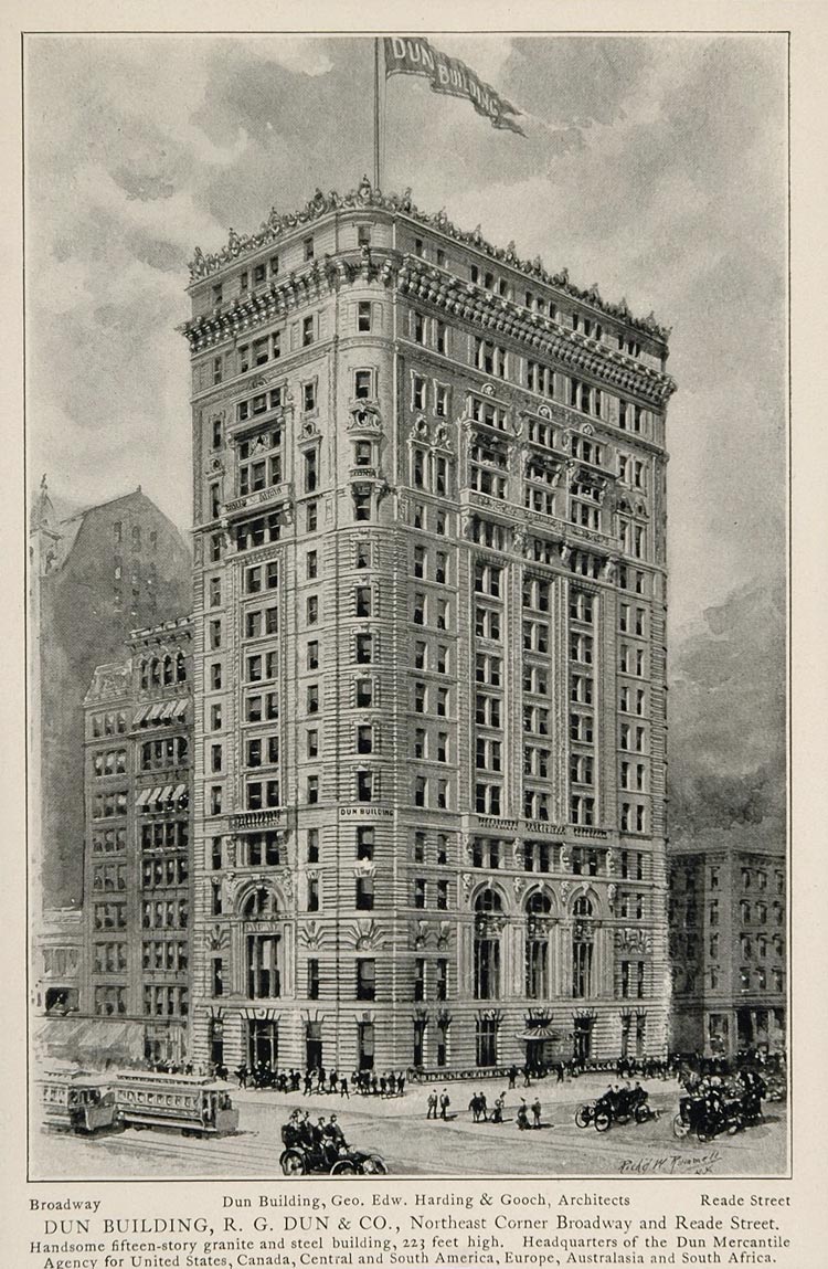 This is an original 1903 halftone print of the R. G. Dun & Co.'s Building at the Northeast corner of Broadway and Reade Street in New York City. Architects: Geo. Edw. Harding & Gooch. Please note that there is printing on the reverse.