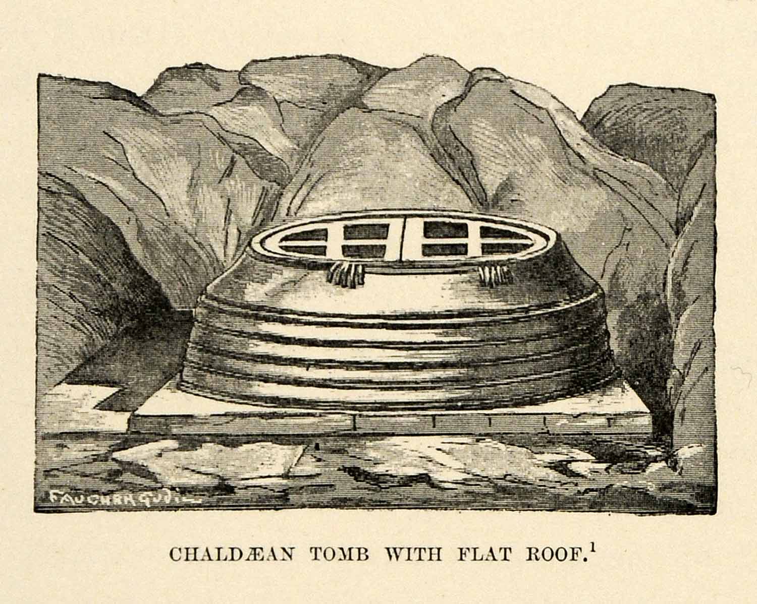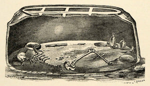 This is an original 1903 halftone print set (two single-sided pages, one measuring at 3.25" by 2.5", and the other at 4.75" by 2.75") of a traditional Chaldaean tomb. Due to the unique terrain around the plains of the Euphrates, it was impractical to produce such structures as pyramids, mastabs, or rock-cut tombs. The alluvial Chaldaean soil was not condusive to preserving bodies, but rather decomposing them. As a result, tombs such as this one were the most suitable resting-places. Inside, the corpse would rest its head upon a flat brick, with one arm outstretched to a nearby vase. Other receptacles containing food and drink were also common, as seen in the additional image.