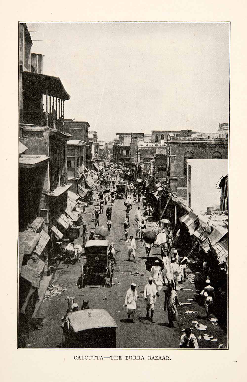 This is an original 1903 black and white halftone print of a street scene at the Burrabazar in Calcutta (Kolkata), India.