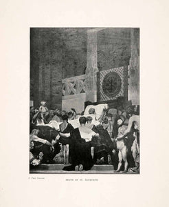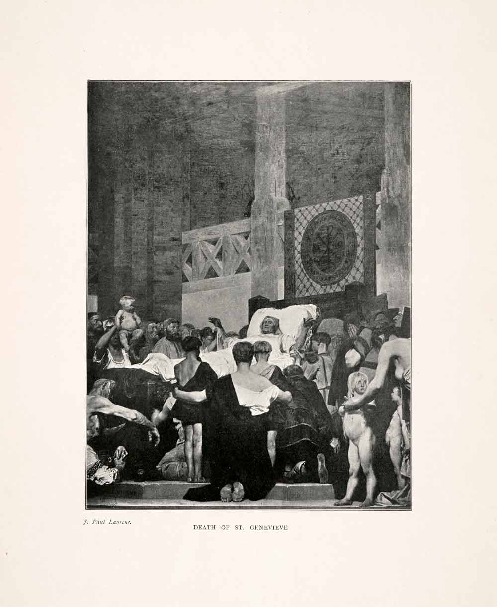 This is an original 1903 halftone print of the death of Saint Geneviève. Geneviève ministered at an abbey that she was later burried in. The church witnessed numerous miracles at her tomb until the Vikings plundered it and it was rebuilt.