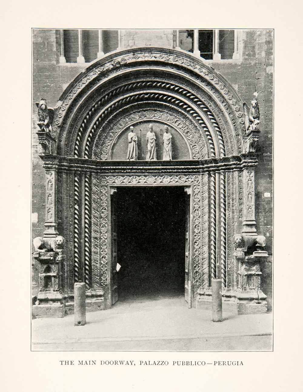 This is an original 1903 black and white halftone print of "The Main Doorway, Palazzo Pubblico, Perugia." Located in Perugia, the Palazzo dei Priori is one of the best examples of thirteenth/fourteenth century public building in Italy; it was constructed from 1293 to 1443.