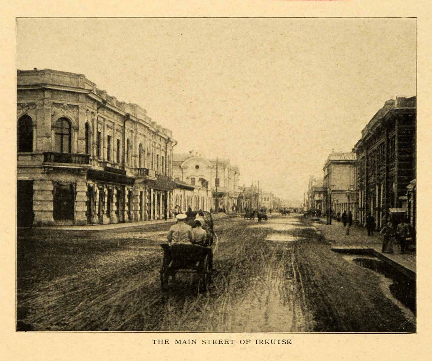 This is an original 1903 halftone print of the main street of Irkutsk, Siberia, Russia. The railway is the longest in the world and connects Moscow to the Russian Far East and the Sea of Japan. Construction of the railway began in 1891, and like the First Transcontinental Railroad of the United States, was started on both ends and worked toward the middle.