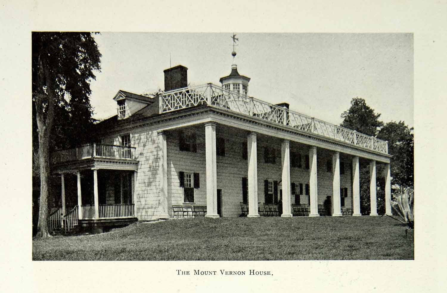 This is an original 1903 black and white halftone print of Mount Vernon, the plantation home of George Washington, first President of the United States.