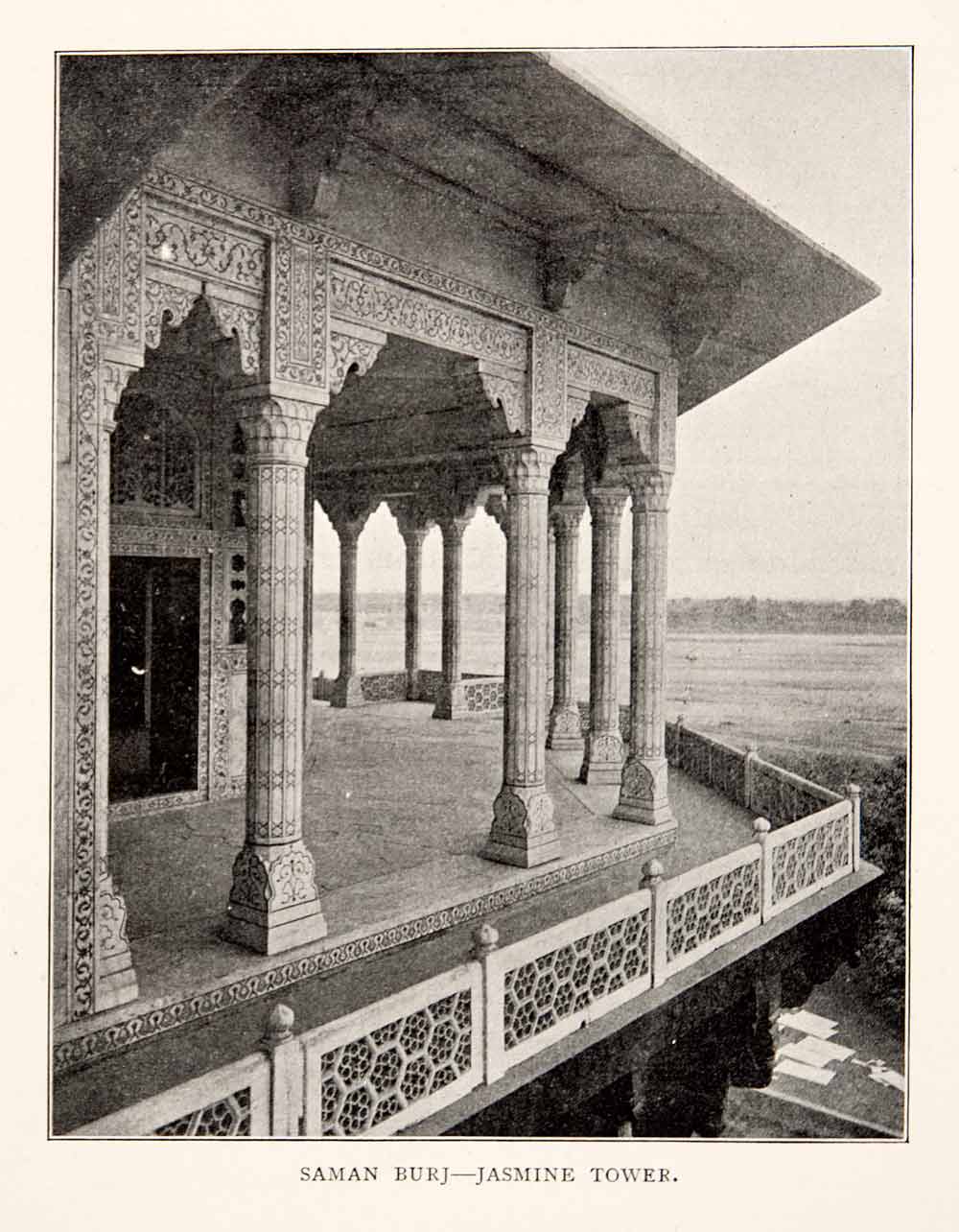 This is an original 1903 black and white halftone print of the Musamman Burj, which is a stunning octagonal tower that overlooks the Yamuna River in India.