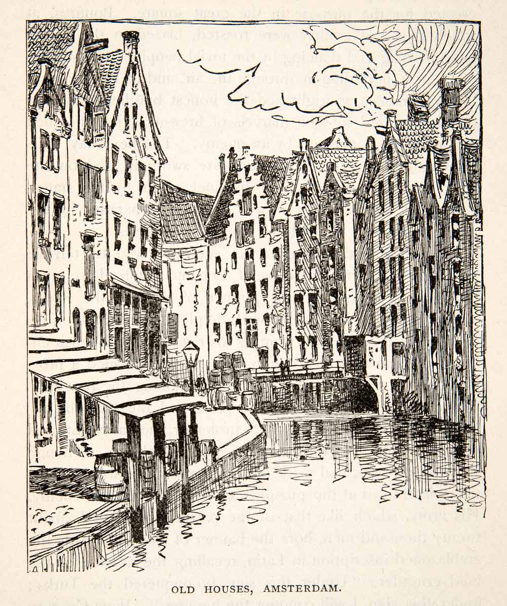 This is an original 1903 black and white relief line-block print of old houses in Amsterdam, Holland.