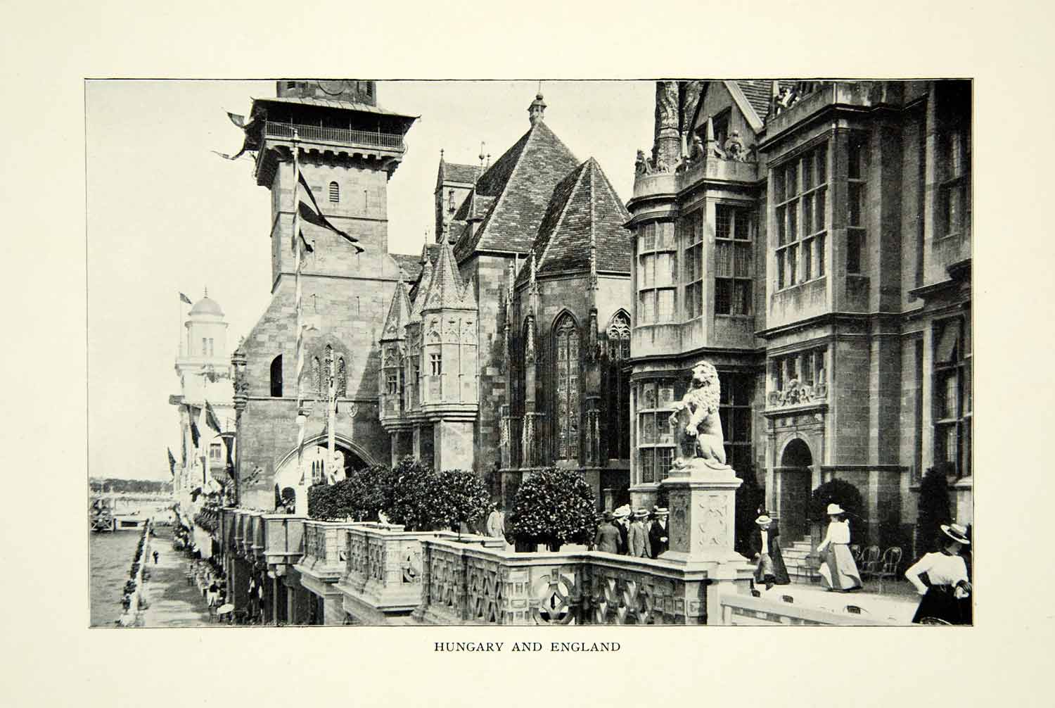 This is an original 1903 black and white halftone print of the Hungary and English buildings at the 1900 Paris Exposition .