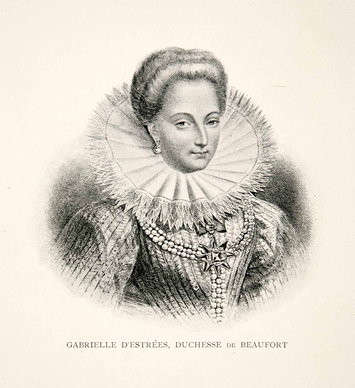 This is an original 1903 black and white halftone print of a portrait of Gabrielle d'Estrées who was the Duchess of Beaufort and was the mistress of King Henry IV of France.