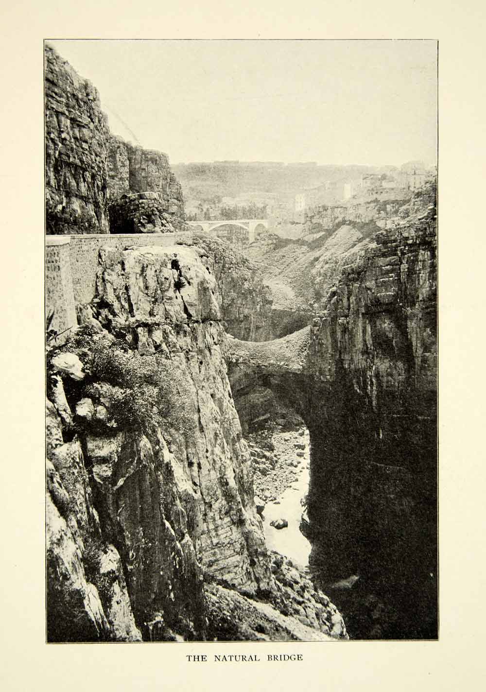 This is an original 1903 black and white halftone print of a natural bridge in the Sedi Mecid Ravine near Constantine, Algiera.
