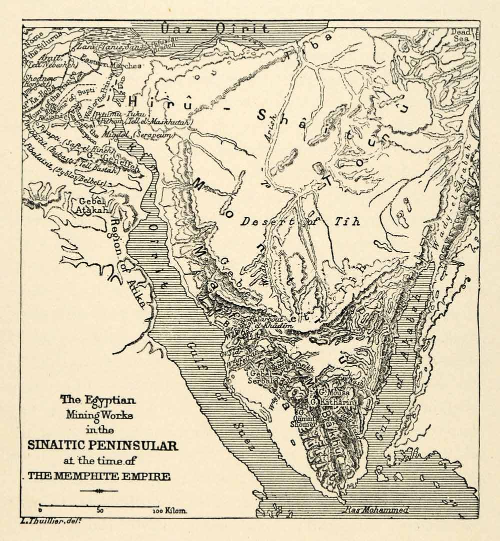 This is an original 1903 halftone print map of the Egyptian mining works in the Sinaitic Peninsula at the time of the Memphite Empire.