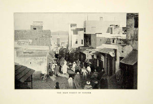 This is an original 1903 black and white halftone print of the main street at Tangier, a major city in northern Morocco.