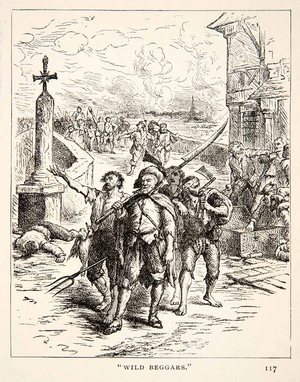 This is an original 1903 black and white relief line-block print of beggars going wild during what we assume, is the Protestant Reformation.