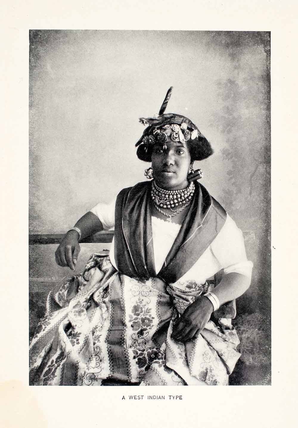 Keywords specific to this image: medallions, bracelets, feather, dress, shawl, "A West Indian Type"
