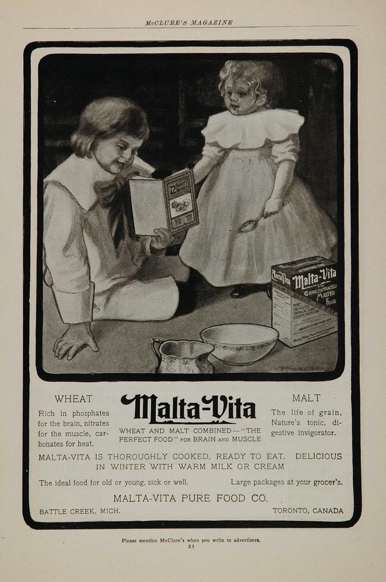 This is an original 1903 black and white print ad for Malta-Vita--a health food made from wheat and malt by the Malta-Vita Pure Food Company of Battle Creek, Michigan and Toronto, Canada.