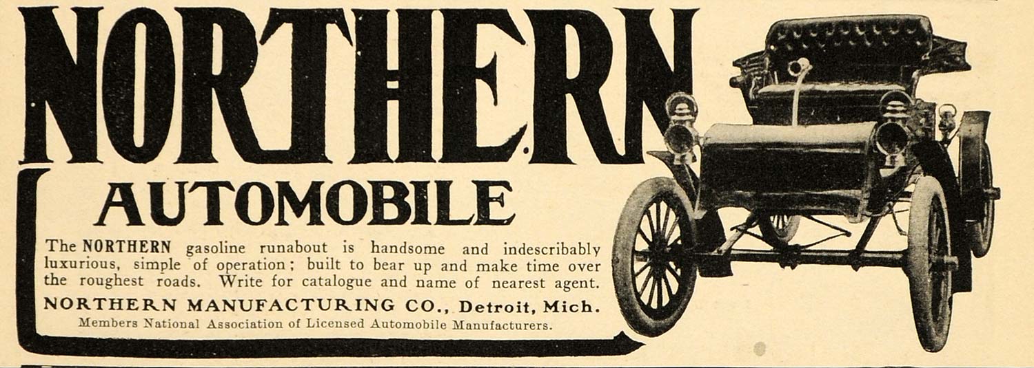 This is an original 1903 black and white print ad for the Northern Runabout Automobile from the Northern Manufacturing Co. of Detroit, MI. This is an excellent original print item for the collector of this antique car!