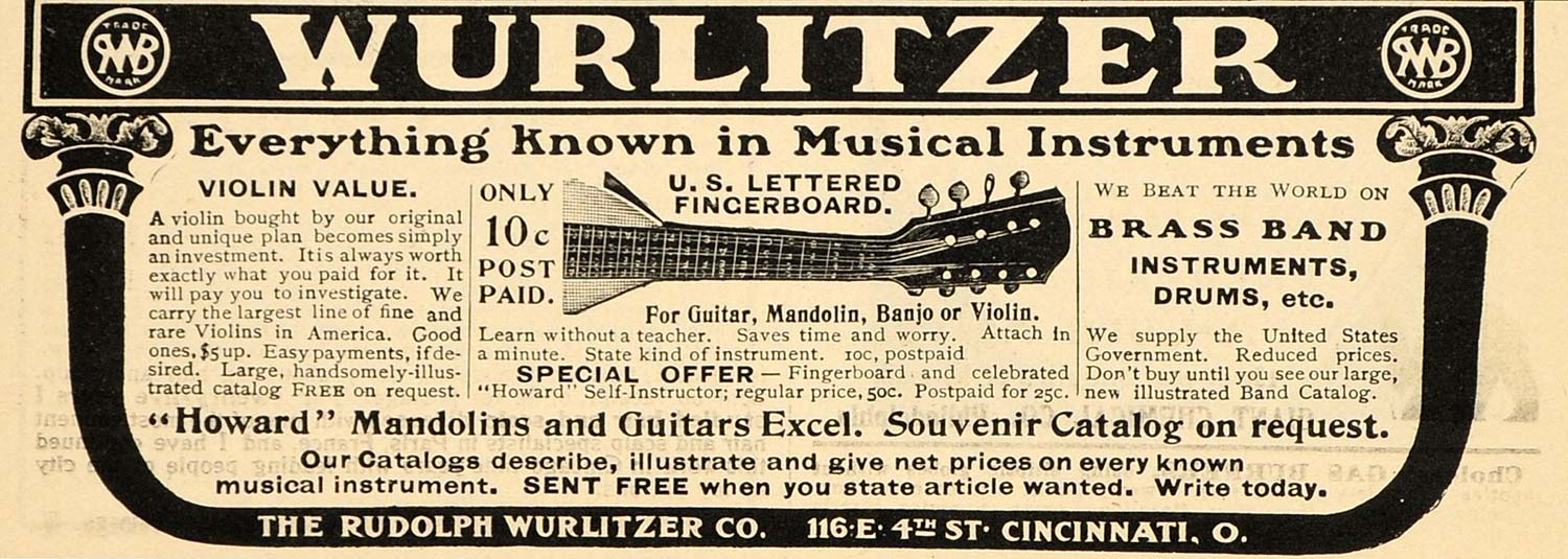 This is an original 1903 black and white print ad for musical instruments from The Rudolph Wurlitzer Co., 116 E 4th St., Cincinnati, Ohio.
