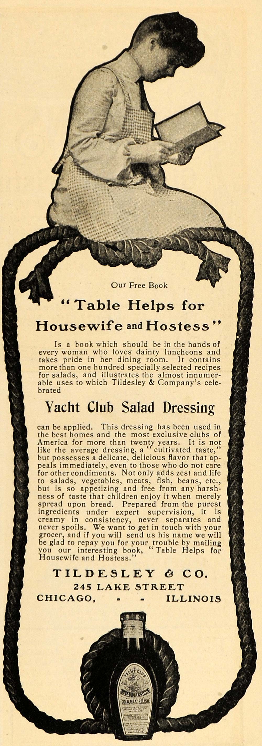 This is an original 1903 black and white print ad for Yacht Club Salad Dressing from Tildesley & Co., 245 Lake Street, Chicago.