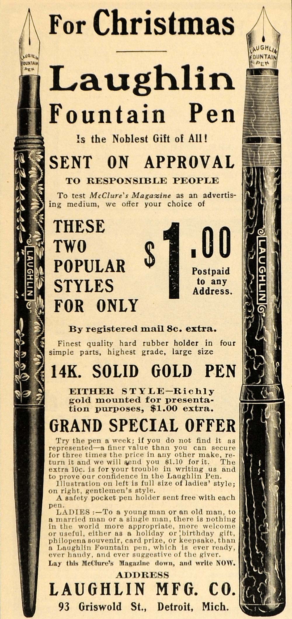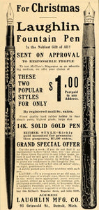 This is an original 1903 black and white print ad for Laughlin Fountain Pens from the Laughlin Mfg. Co., 93 Griswold St., Detroit, MI.