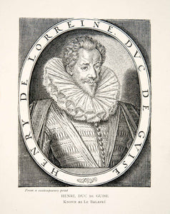 This is an original 1903 black and white wood engraving of a portrait of Henry I, Duke of Guise, France. He was also called "Le Balafré" meaning "the scarred."