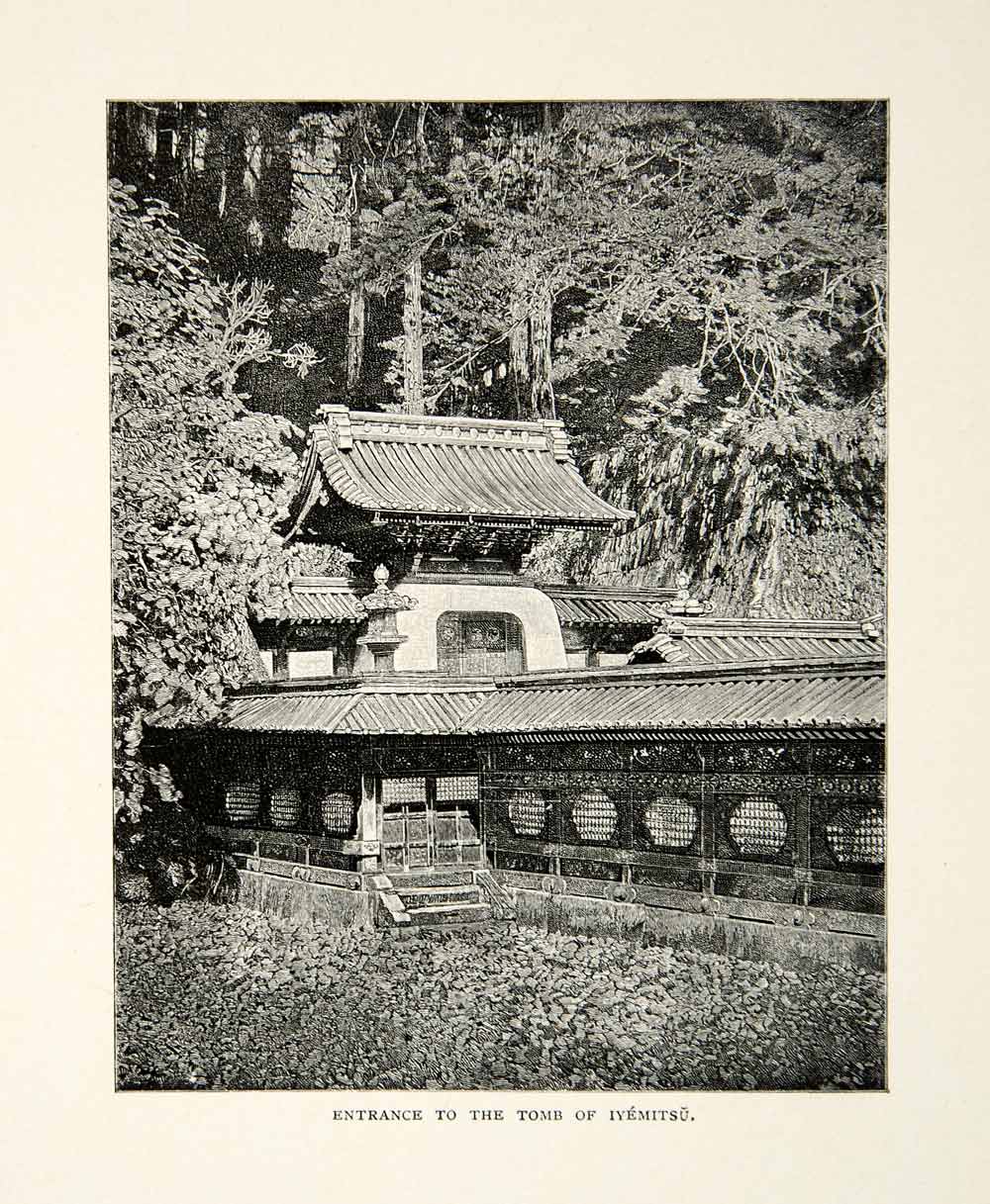 This is an original 1903 black and white wood engraving of the entrance to the Tomb of Iyémitsu in Japan.