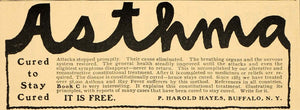 This is an original 1904 black and white print ad for a cure for asthma from Dr. Harold Hayes of Buffalo, N.Y.