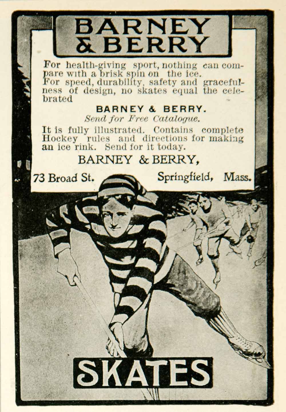 This is an original 1904 black and white print ad for ice skates that were made and sold by Barney & Berry of 73 Broad Street, Springfield, Massachusetts (MA).