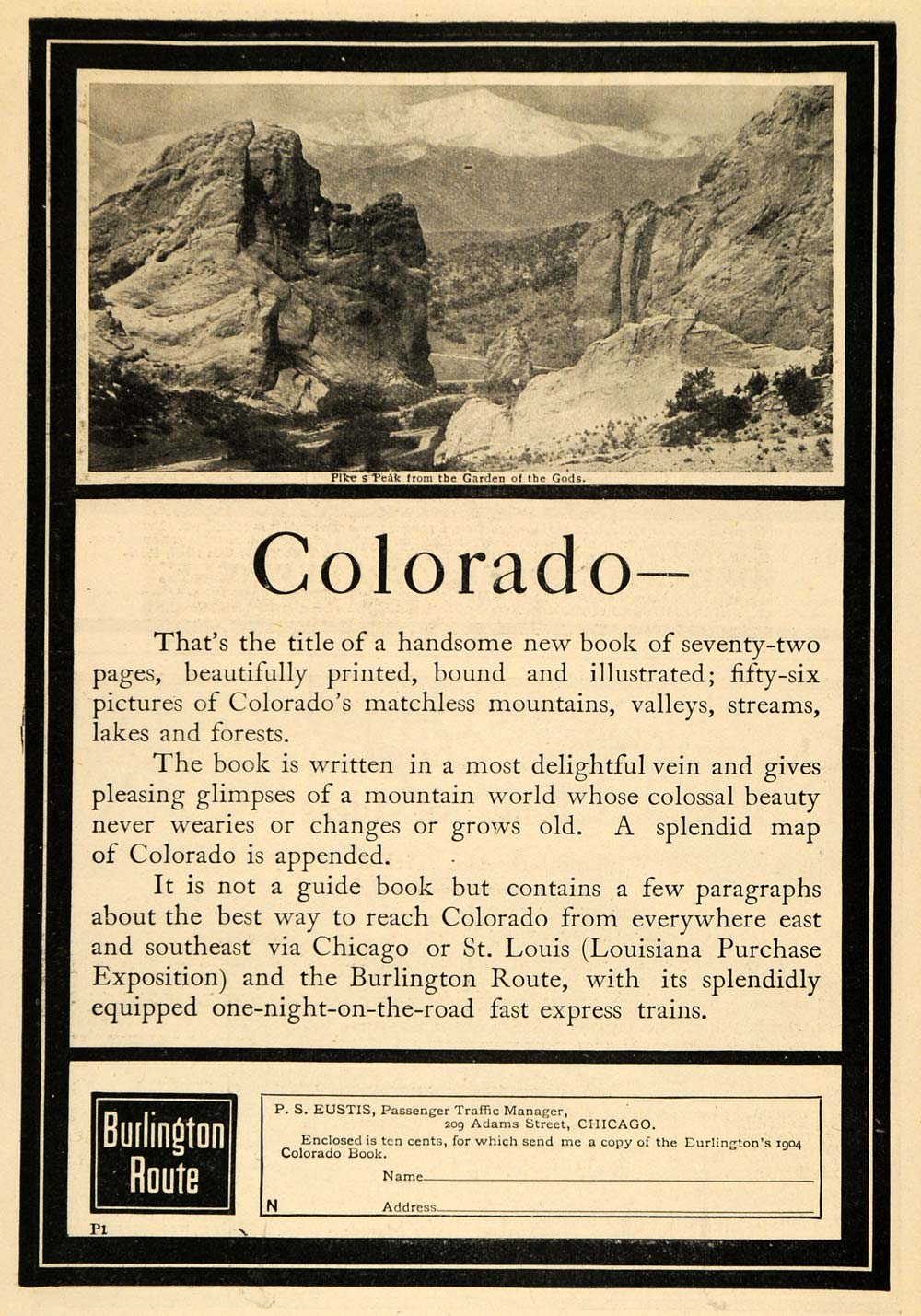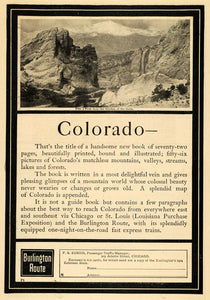 This is an original 1904 black and white print ad for the Burlington Route Railroad.
