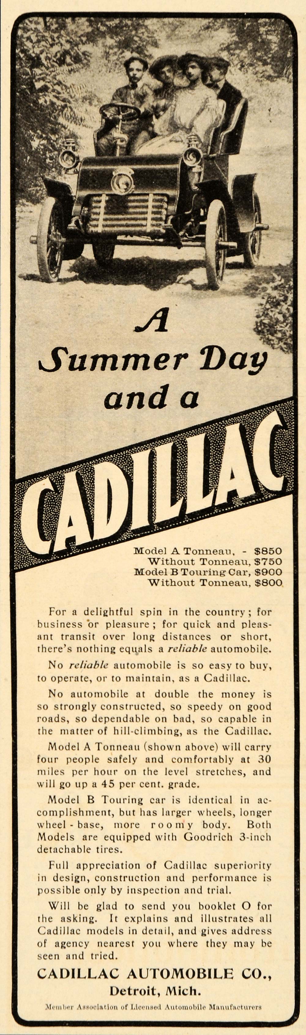 This is an original 1904 black and white print ad for a Cadillac, Model A with Tonneau and without Tonneau, Model B Touring car with and without Tonneau by Cadillac Automobile Company located in Detroit, Michigan.